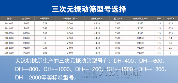 大漢機(jī)械所生產(chǎn)的三次元旋振篩型號(hào)有:DH-400、DH--600、DH--800、DH--1000、DH--1200、DH--1500、DH--1800、DH--2000等標(biāo)準(zhǔn)型號(hào)。