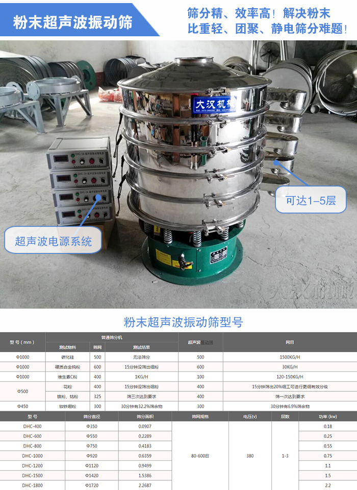 粉末超聲波振動篩型號有:DHC-600、DHC-800、DHC-1000、DHC-1200、DHC-1500、DHC-1800等,層數(shù)可達1-5層(可根據(jù)用戶的要求特殊定制)適用于400目、500目、600目超細物料的篩分、除雜、過濾、分級。