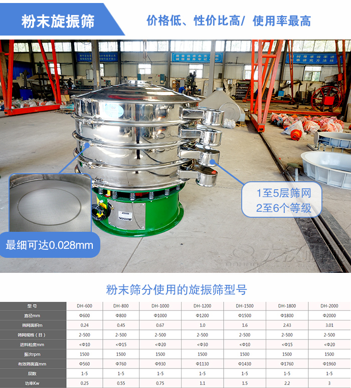 粉末篩分使用的旋振篩也叫做三次元振動篩,型號有:DH-400型、DH-600型、DH-800型、DH-1000型、DH-1200型、DH-1500型、DH-1800型、DH-2000型等八種標準機型。