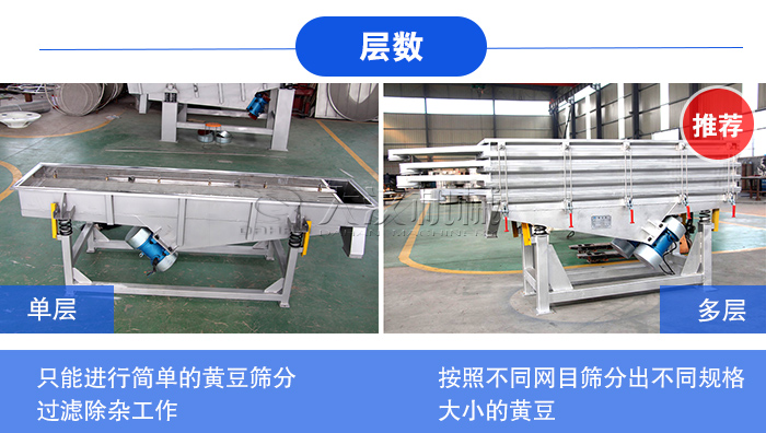 黃豆精選不銹鋼直線篩在篩網(wǎng)安裝的層數(shù)上支持單層和多層,其中最高可達(dá)五層,能篩分出六種不同規(guī)格的物料,功能非常的強大,所以結(jié)構(gòu)越復(fù)雜,價格就會對應(yīng)增加。