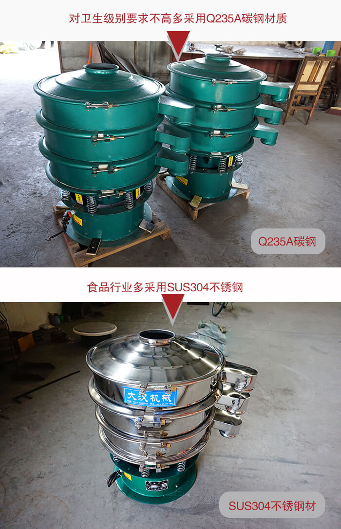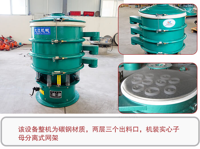 該設(shè)備整機(jī)為碳鋼材質(zhì),兩層三個出料口,機(jī)裝實(shí)心子母分離式網(wǎng)架,歸屬于常見的輕型振動篩分設(shè)備,也就三次元振動篩碳鋼振動篩,本公司生產(chǎn)的DH系列振動篩可根據(jù)客戶不同需求1-5層同時使用,產(chǎn)品型號齊全,可滿足各種粉末、顆粒篩分需要求及液體過濾需求,也可設(shè)計為超聲波振動篩粉機(jī)、氣流振動篩粉機(jī)、振動篩粉機(jī)等機(jī)型。食品行業(yè)多多采用SUS304不銹鋼,對衛(wèi)生級別要求不高多采用Q235A碳鋼作為主要材質(zhì)。