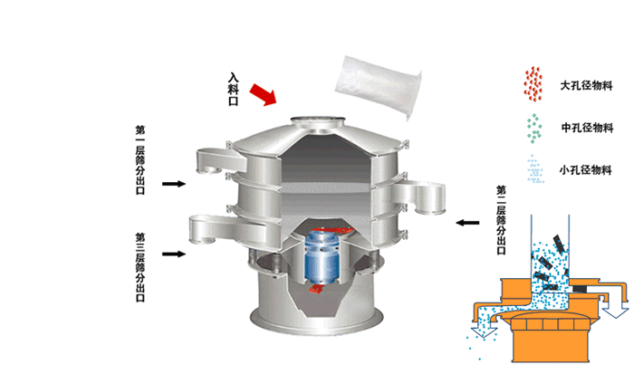 篩粉機(jī)采用YZUL立式振動電機(jī)作為激振源,通過振動電機(jī)上下兩端的偏心重錘將旋轉(zhuǎn)運(yùn)動轉(zhuǎn)變?yōu)樗健⒋怪?、傾斜的三次元運(yùn)動,并傳遞到旋振篩的篩面上;物料通過入料口進(jìn)入設(shè)備內(nèi),根據(jù)不同物料篩分要求,物料經(jīng)過1-5層采用不同目數(shù)的金屬編織篩網(wǎng)的篩分層,在這個過程中,位于各層的篩網(wǎng)下的清網(wǎng)裝置(彈跳球)通過頻率振動不斷撞擊篩網(wǎng),使篩網(wǎng)上層物料能夠順暢的透網(wǎng)篩分,并有效解決了物料堵網(wǎng)問題出現(xiàn),不同目數(shù)的物料通過各層對應(yīng)目數(shù)的篩網(wǎng)后在各層的出料口排出,終實(shí)現(xiàn)篩選除雜或過濾分級的目的。調(diào)節(jié)上、下兩端的相位角,可以改變物料在篩面上的運(yùn)動軌跡,具體如下圖: