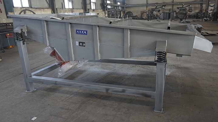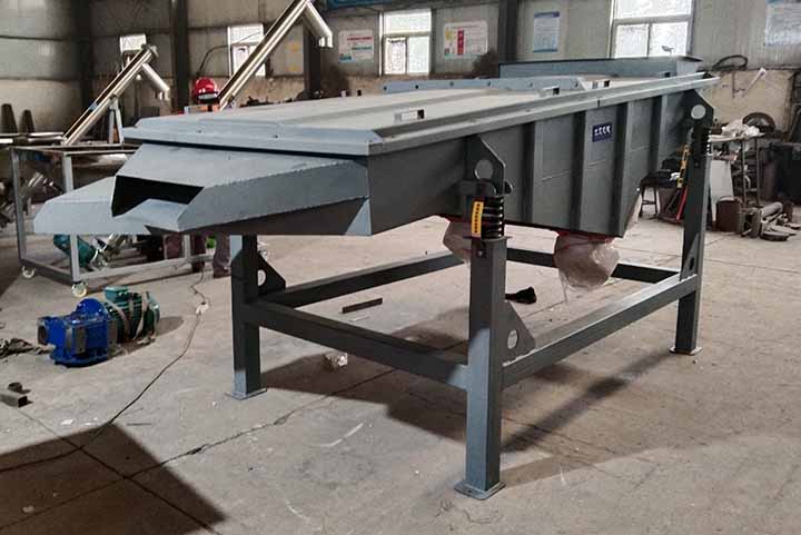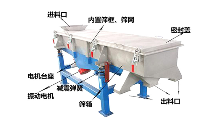 重型直線篩由篩箱、振動(dòng)電機(jī)、減振系統(tǒng)及底架等組成。篩箱由篩框、篩板、襯板等組成。