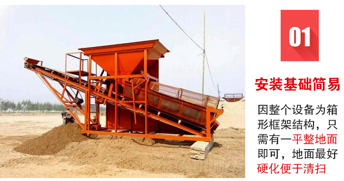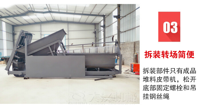 設(shè)備的高度整體性便于施工現(xiàn)場存放或轉(zhuǎn)場運輸,拆裝部件只有成品堆料皮帶機,松開底部固定螺栓和吊掛鋼絲繩,將成品皮帶機塞入主框架底面即可。