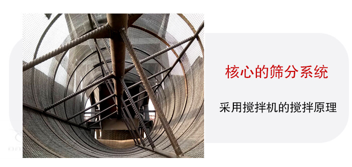 其核心的篩分系統(tǒng)采用攪拌機的攪拌原理,原料在攪拌筒內受連續(xù)螺旋葉片翻滾、推擠及物料間相互磨擦作用,作用強烈可靠性高。
