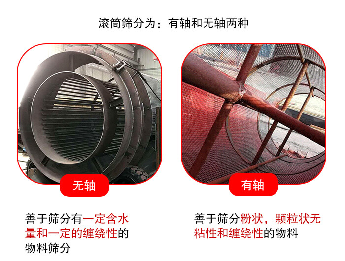2,根據(jù)所篩分的物料選擇不同結構的產品,對于滾筒篩大致能夠分為:有軸和無軸兩種,有軸的善于篩分粉狀,顆粒狀無粘性和纏繞性的物料。無軸的則是和一些有一定含水量和一定的纏繞性的物料篩分。