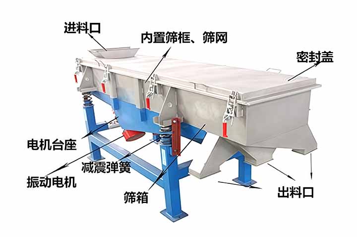 本篩機(jī)主要由篩箱、篩框、篩網(wǎng)、振動(dòng)電機(jī)、電機(jī)臺(tái)座、減振彈簧、支架等組成。