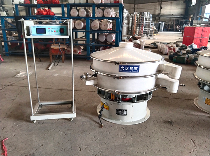塑料防腐蝕振動篩采用YZUL立式振動電機作為激振源,通過振動電機上下兩端的偏心重錘將旋轉(zhuǎn)運動轉(zhuǎn)變?yōu)樗健⒋怪?、傾斜的三次元運動,并傳遞到旋振篩的篩面上;物料通過入料口進入設備內(nèi),根據(jù)不同物料篩分要求,物料經(jīng)過1-5層采用不同目數(shù)的金屬編織篩網(wǎng)的篩分層,在這個過程中,位于各層的篩網(wǎng)下的清網(wǎng)裝置(彈跳球)通過頻率振動不斷撞擊不銹鋼篩網(wǎng),使篩網(wǎng)上層物料能夠順暢的透網(wǎng)篩分,并有效解決了物料堵網(wǎng)問題出現(xiàn),不同目數(shù)的物料通過各層對應目數(shù)的篩網(wǎng)后在各層的出料口排出,終實現(xiàn)篩選除雜或過濾分級的目的。